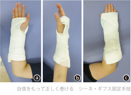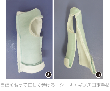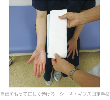 - 片手で患者の指先を掴んで手〜前腕を垂直に保持し,反対の手でスプリント材がズレないように保持しつつ,手関節を固定肢位で保持してもらいます.