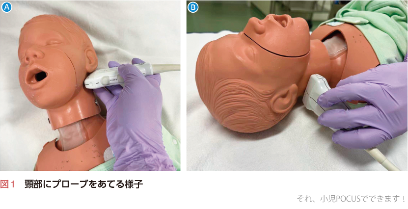 患者さんは仰臥位とし,肩枕を入れるなどして頭部をやや後屈させ,観察部位の反対側へ頸部を回旋させるとより観察しやすいです(図1A).仰臥位を嫌がる乳幼児では,保護者の抱っこや坐位でもあてることは可能です.プローブはリニア型プローブを用います.腫れて痛がる部位にあてる際には,ゼリーをたっぷり使用し,圧迫を最小限にすることを心がけましょう(図1).
