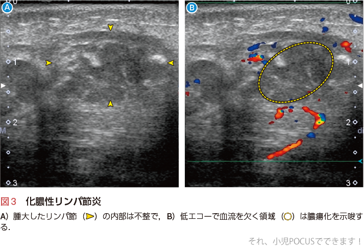 腫脹や圧痛が最も強い部位にプローブをあてると,周囲のリンパ節と比べてもひと際大きく腫大したリンパ節を同定できることが多いです(図3A).内部は低エコーで,血流は亢進しています.周囲の軟部組織の浮腫や腫脹を伴うことも多く,蜂窩織炎を合併している場合もあります.膿瘍形成を生じると,膿瘍部分がさらに低エコーとなり,血流は減弱・消失します(図3B).