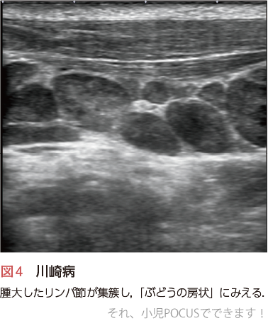 例えば川崎病を疑う乳児で,頸部リンパ節腫大の有無を判別しにくいと感じたことはありませんか? 頸部リンパ節腫大は川崎病において診断基準の1項目を担う重要な所見ですが,乳児では頸部の皮下脂肪が厚く,また前述したとおり「ぶどうの房」のように複数が同時に腫大したリンパ節は一つひとつの縁を触知しづらいことから,触診では腫大の有無が判断できないことがあります.そんなときにエコーで見ると,触診ではわからなかった複数のリンパ節の腫大が明らかで川崎病の診断に役立つ,といった場面を筆者はしばしば経験します.