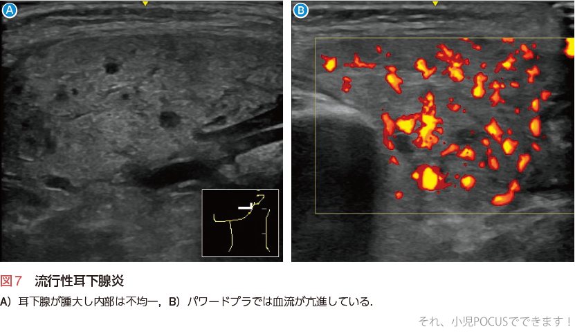 ムンプスウイルスによる耳下腺炎で3〜6歳頃に多く,耳下腺は両側性ときに片側性に腫大します(図7A).エコーでは内部エコーは不均一でやや低エコーを呈します.腺管の拡張はみられません.カラードプラでは健側と比べて血流が亢進します(図7B).