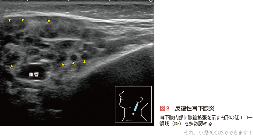 2〜6歳頃に発症し,年に数回両側または片側の耳下腺の有痛性腫脹をきたす疾患です.多くの症例では10歳頃までに自然治癒します.耳下腺自体の腫大は目立たず,耳下腺内部の腺管拡張が生じるため2〜4 mm程度の円形の低エコー領域が多数認められます(図8).