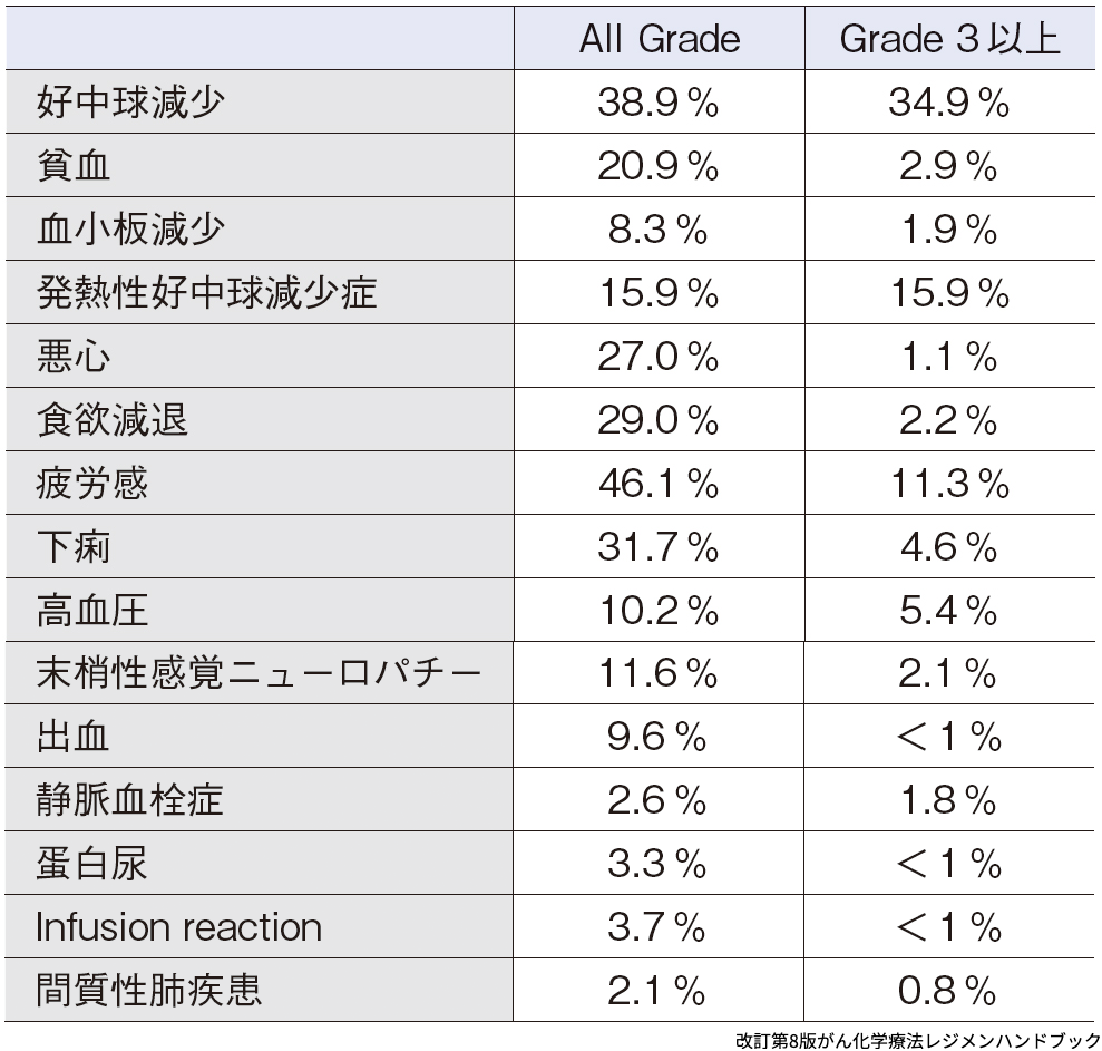 ① 発熱性好中球減少症(FN):DTX 単独療法と比較して,Ramucirumab 併用療法では好中球減少症の頻度が高まるため,患者には感染予防(手洗い,うがい,マスクの着用など)の励行を指導する必要がある.日本人ではFN の頻度が34%と高いこともあり,FNリスクなどを考慮してG-CSF製剤の一次予防投与も考慮する.