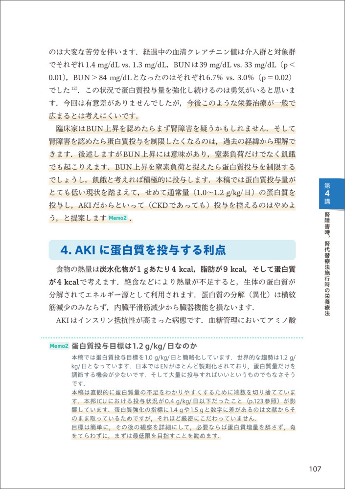1. はじめに/2. 血清クレアチニン値が高いから蛋白質投与量を制限する,は正しいのか/3. 蛋白質投与量は多ければ多いほどいいのか?/4. AKIに蛋白質を投与する利点/5. AKIの栄養投与目標/6. 投与経路/7. 蛋白質投与量を決定するために知っておきたいこと/8. 栄養評価/9. 窒素バランス測定/10. RTPを栄養評価に用いることの妥当性/11. 腎障害時の栄養治療の今後