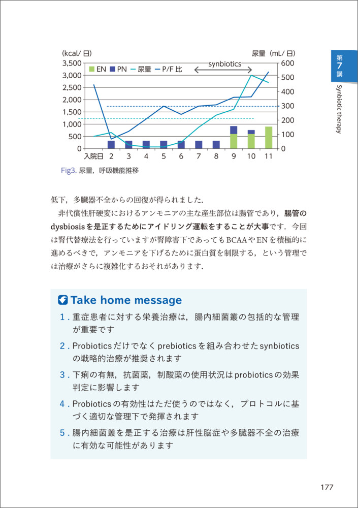 1. はじめに/2. Probioticsに期待される効果/3. Probioticsを用いる際の困難/4. Probioticsに関連する有害事象/5. 日本版重症患者の栄養療法ガイドラインにおけるprobiotics/6. Synbiotic therapyの実際/7. Synbiotic therapyの応用/8. 肝硬変,肝性脳症と腸内細菌叢/9. BCAA補充の実際