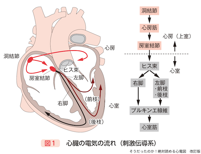 - 洞結節で起きた電気的興奮(刺激)が左右の心房筋を伝わって房室結節へ入り,ヒス(His)束,左・右脚,そしてプルキンエ(Purkinje)線維を介して左右の心室筋へ規則正しく伝えられます.このような電気の伝わる仕組みのことを刺激伝導系と呼びます(図1)
