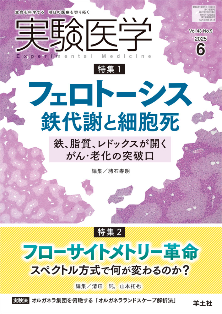 特集1:がんや老化,組織傷害など多様な病態にかかわる鉄依存性細胞死「フェロトーシス」.その制御メカニズムの解明と,治療法開発をめざす研究の最前線を徹底解説./特集2:多色化・簡便化を実現した新方式のフローサイトメトリー.活用事例を交えながら、研究の可能性がどのように広がるかをご紹介します.