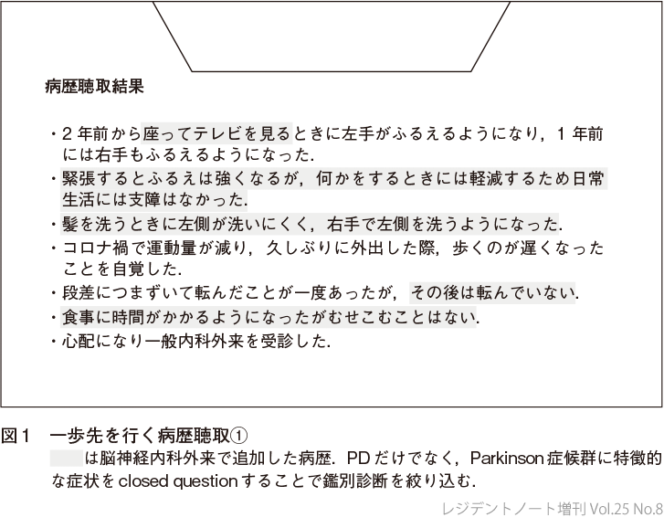 現病歴:2年前から左手がふるえるようになり,1年前から右手もふるえるようになった.コロナ禍で運動量が減り,久しぶりに外出した際,歩くのが遅くなったことを自覚した.段差につまずいて転んだことがあった.心配になり内科を受診した.