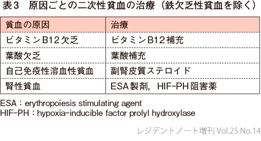 鉄欠乏性貧血以外では,鉄補充療法は無効である.高度な貧血に対しては赤血球輸血を行うが,効果は一時的なので,原因疾患に対する治療があれば,それを行う必要がある(表3).提示症例のように,自己免疫性萎縮性胃炎や胃切除術の既往に関連したビタミンB12欠乏性貧血では,ビタミンB12製剤の筋注もしくは内服を生涯続けていく必要がある.