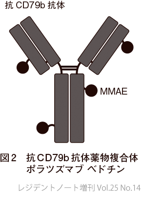 R-CHOP療法を構成するビンクリスチンをポラツズマブ ベドチンに置き換えた多剤併用化学療法としてPola-R-CHP療法(図1B)が開発され,未治療DLBCLを対象とした第Ⅲ相試験で,Pola-R-CHP療法ではR-CHOP療法より無増悪生存割合が優れていることが示されている2).ポラツズマブ ベドチンは,CD20と同様に正常B細胞やB細胞リンパ腫の腫瘍細胞の細胞膜に発現するCD79bに対する抗体に,微小管重合阻害薬モノメチルアウリスタチンE(MMAE)を結合させた抗体薬物複合体(図2)である.CD79bに結合した後,細胞内にとり込まれ,細胞内で抗体とMMAEとの結合が切れ抗腫瘍効果が発揮される.