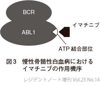 イマチニブは,BCR-ABL1チロシンキナーゼのATP結合部位に結合し,BCR-ABL1の活性を阻害するようにデザインされた経口のチロシンキナーゼ阻害薬(tyrosine kinase inhibitor:TKI)である(図3).CML慢性期の患者を対象として行われた,当時の標準治療であったインターフェロンとの比較第Ⅲ相試験で,細胞遺伝学的寛解割合がイマチニブ群の方が優れており,無増悪割合も高かったため,イマチニブがCML慢性期の標準治療薬となった3).その後,同様のチロシンキナーゼが複数開発され,イマチニブよりもCMLに対する効果が優れているとされている.イマチニブ抵抗性の患者では,BCR-ABL1遺伝子の変異がみられることが多く,変異によりBCR-ABL1融合タンパク質のキナーゼ領域の構造が変化し,イマチニブとの結合が低下していることが治療抵抗性の機序となっている.ダサチニブ,ニロチニブ,ボスチニブ,ポナチニブなどの新しいTKIは,イマチニブ抵抗性となるBCR-ABL1遺伝子の変異に対して有効なことがあるが,TKIの種類によって有効な変異の種類が異なる.また,TKIでは種類によりさまざまな有害事象が知られているが,その一部はBCR-ABL1以外のチロシンキナーゼに対する阻害作用(オフターゲット効果)によるものである.