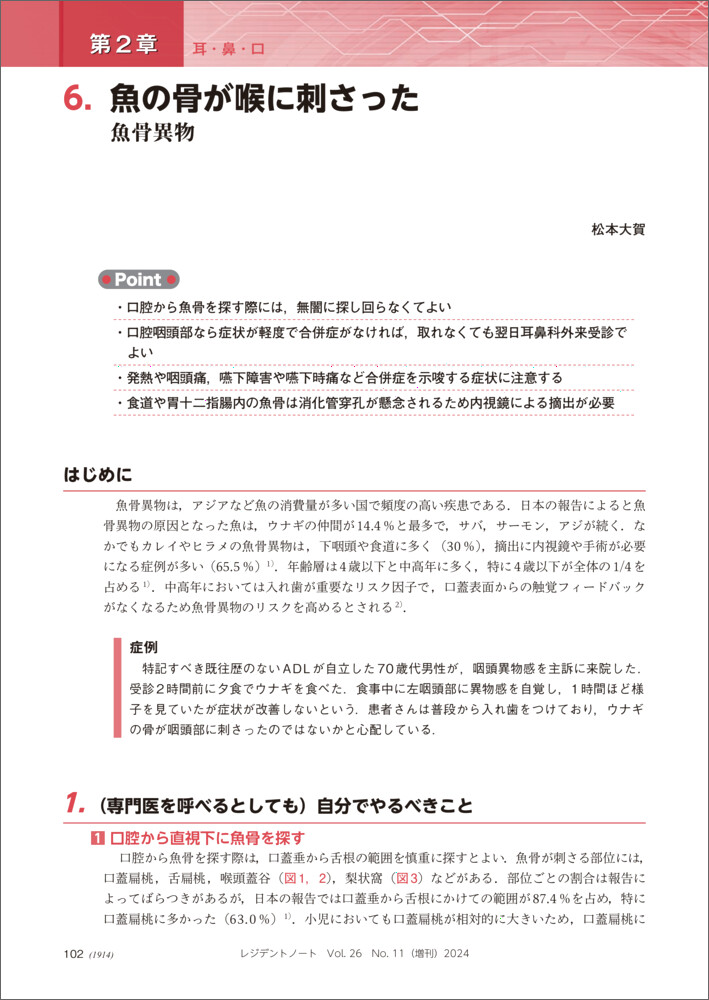 - 【本書名】レジデントノート増刊:新版 マイナーエマージェンシー いざというとき慌てない!!〜針が刺さった、餅がつまった、動物に咬まれたなど慣れない症候に対応するための自分がやるべきこと・専門医へのつなぎ方