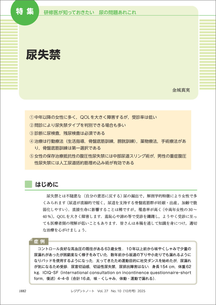 頻尿や尿失禁など排尿の問題を抱える患者さんは多く,研修医の皆さんも病棟で患者さんや看護師などから相談を受けることは頻繁にあるでしょう.泌尿器科の教科書を見たり先輩に聞いたりして対応していることと思いますが,本当に正しい評価,正しい処置ができていますか?…