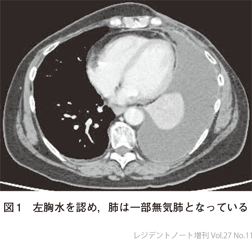64歳女性.ホルモン受容体陽性乳がんの術後フォロー中に左胸水を指摘され,PET(positron emission tomography:陽電子放出断層撮影)CT検査で多発リンパ節転移と多発骨転移を認めた.頸部リンパ節生検でホルモン受容体陽性乳がん再発の診断となり,レトロゾール+パルボシクリブ内服を開始.治療開始12カ月後のCT検査で左胸水増加を認め(図1),労作時息切れの訴えがあった.