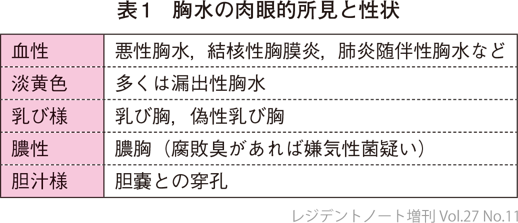 がん患者の胸水貯留の原因は腫瘍の胸膜浸潤による悪性胸水以外にも,心不全や肺炎,肝硬変,低アルブミン血症などさまざまである.胸水の肉眼所見や性状から病態を予想することは可能だが(表1),淡黄色の場合でも悪性胸水の診断に至ることはしばしばみられるので注意する.悪性胸水の原発巣としては,肺がん,乳がん,悪性リンパ腫,卵巣がん,悪性中皮腫などが多い.