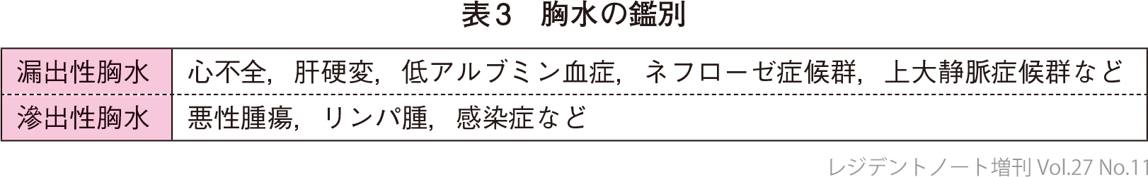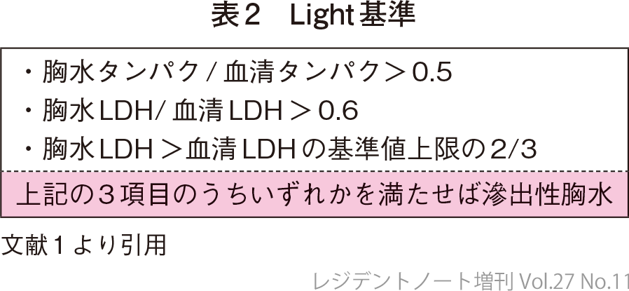 胸水はLight基準(表2)1)により漏出性と滲出性に分けられるが,Light基準は特異度がやや低いため滲出性胸水の除外に役立つ(Light基準を一つも満たさない場合は漏出性胸水の可能性が高い)2).主な胸水の鑑別を表3に示した.