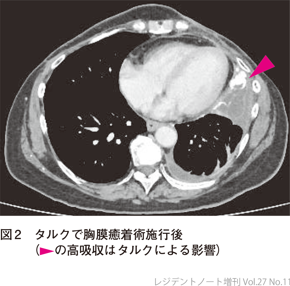 使用する薬剤はタルクがほかの薬剤に比較して有効性が高く4),当院でも基本的にはタルクを用いて胸膜癒着術を施行する.手技の詳細に関しては誌面の都合上,本稿では割愛させていただく.