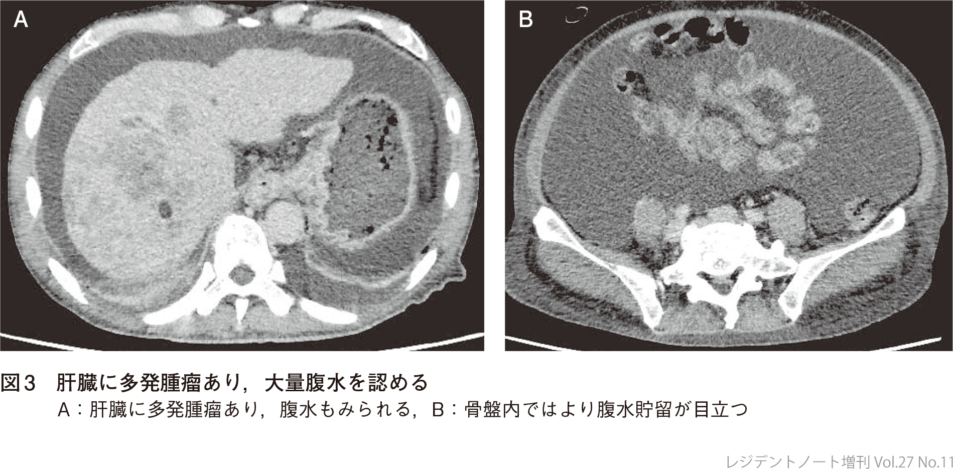 70歳男性.転移進行肝内胆管がんに対して,デュルバルマブ+シスプラチン+ゲムシタビンで治療中.治療開始して約6カ月後の外来で食欲低下と腹部膨満の訴えあり,CT検査では大量腹水を認めた(図3).