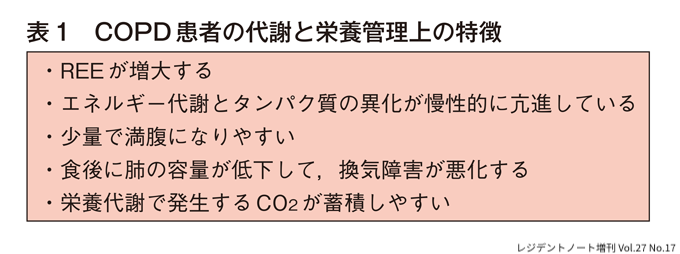 具体的にどれくらいの栄養投与が必要でしょうか.前述のようにCOPD患者では呼吸に費やす余分なエネルギー量によってREEが1.2~1.5倍に上昇するため,栄養状態を改善・維持するためには同年代の健常者より多くの栄養摂取/投与が必要です.しかし一方で,肺の過膨張によって横隔膜が平坦化しているため少量で満腹になりやすく,逆に食事をとることで横隔膜が引き上げられ換気が妨げられます.以上より,少量で効率よく栄養素を摂取/投与すること,栄養代謝で発生する二酸化炭素(CO2)をできるだけ抑えることが栄養療法のポイントになります.COPD患者の代謝と栄養療法上の特徴を表1に示します.