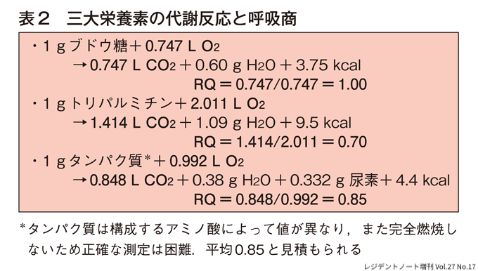 栄養代謝で発生するCO2についておさえておきましょう.三大栄養素は酸素(O2)を使って燃焼し,エネルギー源であるATP(adenosin triphosphate)を生み出すと同時に水(H2O)とCO2を産生します.消費するO2と産生されるCO2の比率,つまり呼吸商(RQ=産生CO2量/消費O2量)は栄養素ごとに異なり,糖質は消費するO2に対して同量のCO2を産生する(RQ=1.0)のに対して,脂質では7割(RQ=0.7),タンパク質は構成するアミノ酸組成によって異なりますが平均してRQ=0.8と見積もられています(表2).主なエネルギー源が糖質と脂質であることを考えると,RQの高い糖質を減量してRQの低い脂質を増量する方が,COPD患者においては有利と推察されます.特に人工呼吸器を装着した急性期の重症患者においては,高脂肪・低炭水化物食を投与すると,人工呼吸器からの離脱時間が短縮されたと報告されています6).