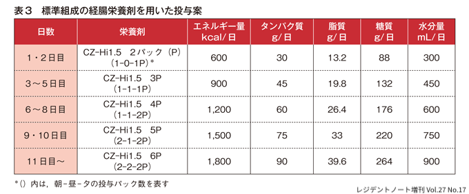 COPDでは消化管に問題がないことがほとんどなので,こちらを優先します.動脈血中の二酸化炭素分圧が上昇したⅡ型呼吸不全の状態でなければ,標準組成の栄養剤を用います.効率よく栄養を投与するために高エネルギー密度(1.5 kcal/mL)の栄養剤を選択しましょう.本症例の場合は600 kcal/日から開始して2~3日ごとに300 kcalずつ増量し,9日間かけて急性期目標量に到達し,以後安定期の必要量に増量します(表3).水分量は栄養剤の含有量だけでは不十分なので,合計1,700 mL程度になるよう追加水270 mL×3回を投与します.