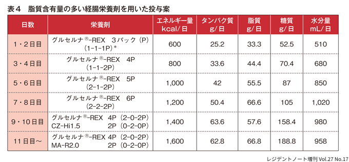 一方,治療によっても高二酸化炭素血症が遷延する場合は,内呼吸でのCO2の産生抑制を図るために脂肪含有量の多い栄養剤を選択したほうが有利かもしれません.グルセルナ®-REX(脂質のエネルギー比50 %)で投与計画を立ててみましょう.濃縮タイプではないため用量が多くなると呼吸に負担をかける可能性があり,増量に応じて一部を高エネルギー密度の標準組成栄養剤と組合わせます(表4).