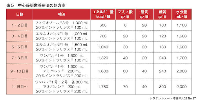 何らかの理由で経管栄養が実施できない場合は経静脈栄養を選択します.末梢から適切な輸液量で必要な栄養量を投与することは困難なので,PICC(peripheral inserted central venous catheter)などCVCを挿入してTPN輸液を投与します.経管栄養の場合と同様に600 kcal程度の少量から開始して,数段階を経て必要量まで増量します(表5).脂肪乳剤も開始早期から積極的に使いましょう.また,三大栄養素だけではなく,ビタミン・微量元素も1日必要量を充足しているか確認します.投与案(表5)では7日目以降の処方で5大栄養素すべての1日必要量を充たします.ただし,微量元素については9種類のうち5種類(鉄,亜鉛,銅,マンガン,ヨウ素)しか含みません.長期化する場合は特にセレン欠乏に留意しましょう.