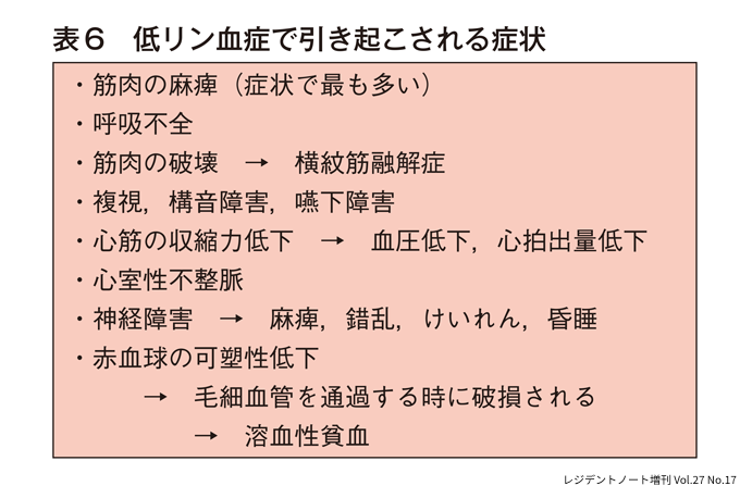 治療早期は,栄養状態の改善より再栄養治療に伴う合併症を引き起こさないためのモニタリングが重要になります.最も注意すべき合併症はリフィーディング症候群です.長期間低栄養状況下に置かれると,主なエネルギー源は糖質から貯蔵脂肪および体タンパク質の分解で得られた脂肪酸とアミノ酸に移行します.この代謝状況下で過剰な糖質を投与するとインスリン分泌が惹起され,グルコースが急速に細胞内に取り込まれると同時に血液中のリン(P),カリウム(K),マグネシウム(Mg)も細胞内に移動し,これらの電解質の血中濃度が急激に下がることで引き起こされます.特にPの低下が病態の主体であり,ATP産生障害に伴ってさまざまな症状を呈します(表6).リフィーディング症候群を引き起こさないためには少量から栄養投与を開始して漸増し,目標量に到達するまでは頻回に電解質をモニタリングして,PとKを正常範囲内やや高めになるよう必要に応じて補充します.Mgは栄養治療経過で正常化することが多い印象です.特に経静脈栄養時にグルコースだけで増量していくとCO2の産生量が増量するだけでなくリフィーディング症候群発症のリスクを高めます.早期からアミノ酸,脂肪を含む処方にしましょう.