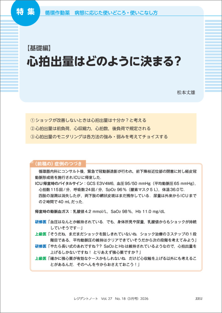 本特集を企画するにあたり,私がはじめてレジデントノートに執筆したときの特集『敗血症診療 その“一晩”を乗り越える』(2021年12月号)1)を久しぶりに開きました.編集者であり,私の恩師でもある髙場章宏先生が冒頭で「EGDT(early-goal-directed therapy,早期目標指向型治療)が敗血症の予後を改善しなかった」という解説をし,それに関して以下のようにコメントされていました.…