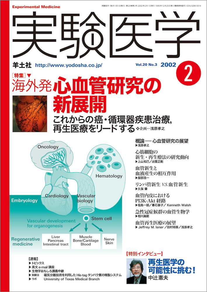 心血管研究は,心不全などの心臓疾患や動脈硬化といった血管疾患の病態,さらに腫瘍形成メカニズムの解明を基盤とし,その治療法確立に向けて発展してきた分野ですが,近年多くの興味深いトピックスを生み出しています.心筋・血管細胞の前駆細胞や多分化能をもつ幹細胞が発見され,それらを応用した再生治療に大きな期待が集められているためです.このように,心血管研究は循環器病学の枠を超え,広く医科学全般に影響を与えるようになっています.そこで今回は,特に海外で活躍なさっている先生方に最先端の内容をご執筆いただきました.海外ならではの創造性に富む研究の動向を感じとっていただける内容です.